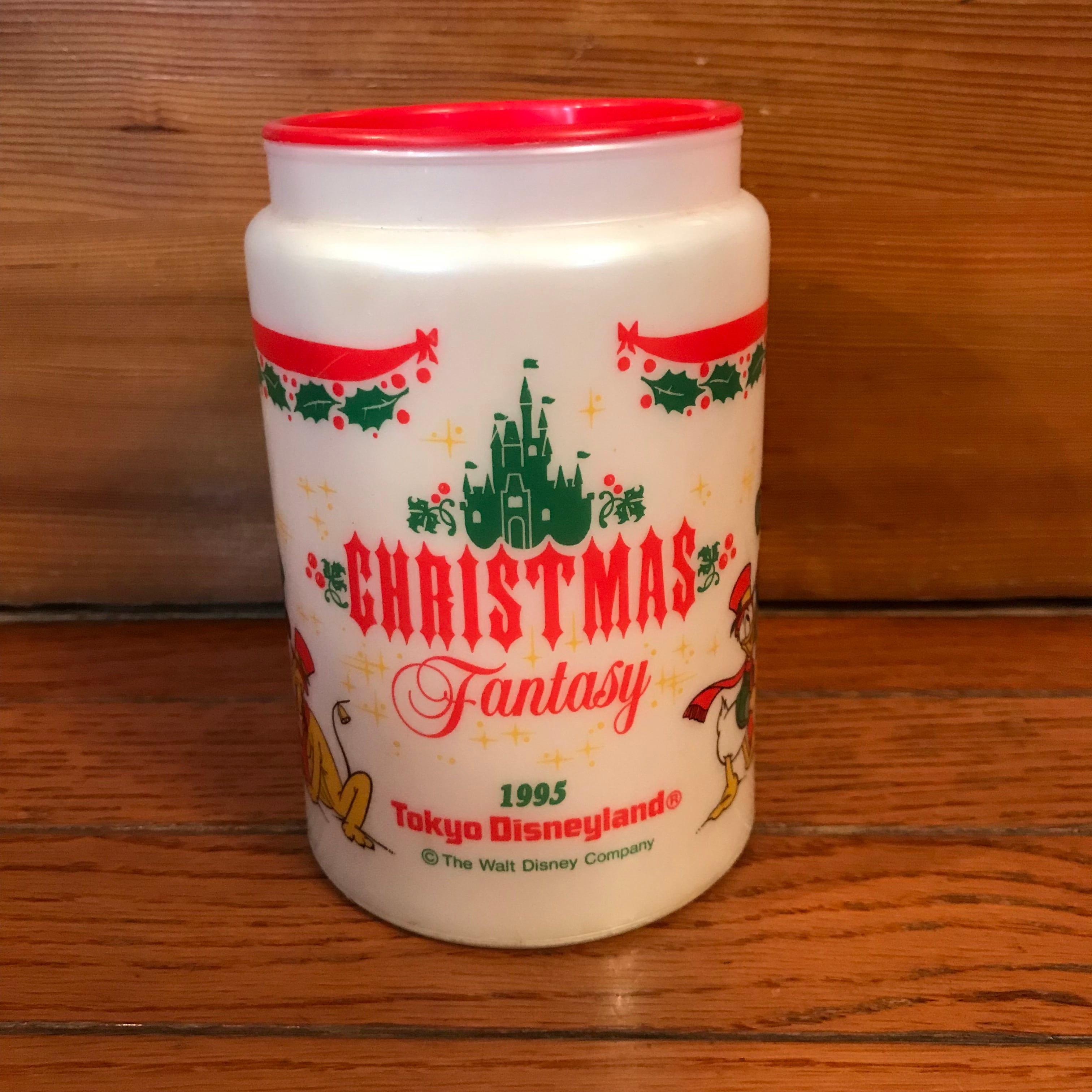 1995年にディズニーランドのクリスマスシーズンに購入したクリスマス・ファンタジー(Christmas Fantasy)のプラスチック製ジョッキ『CHRISTMAS FANTASY LARGE CUP/MUG』のヴィンテージアイテムです。